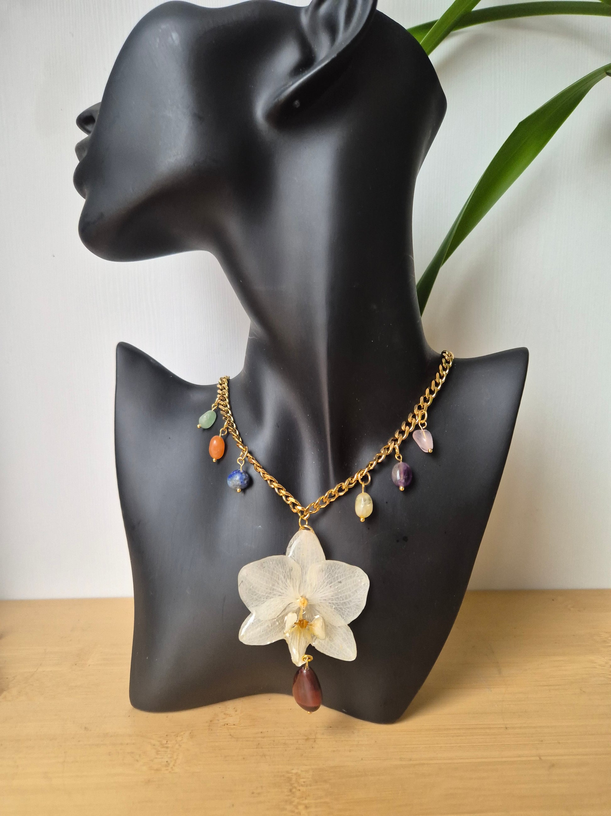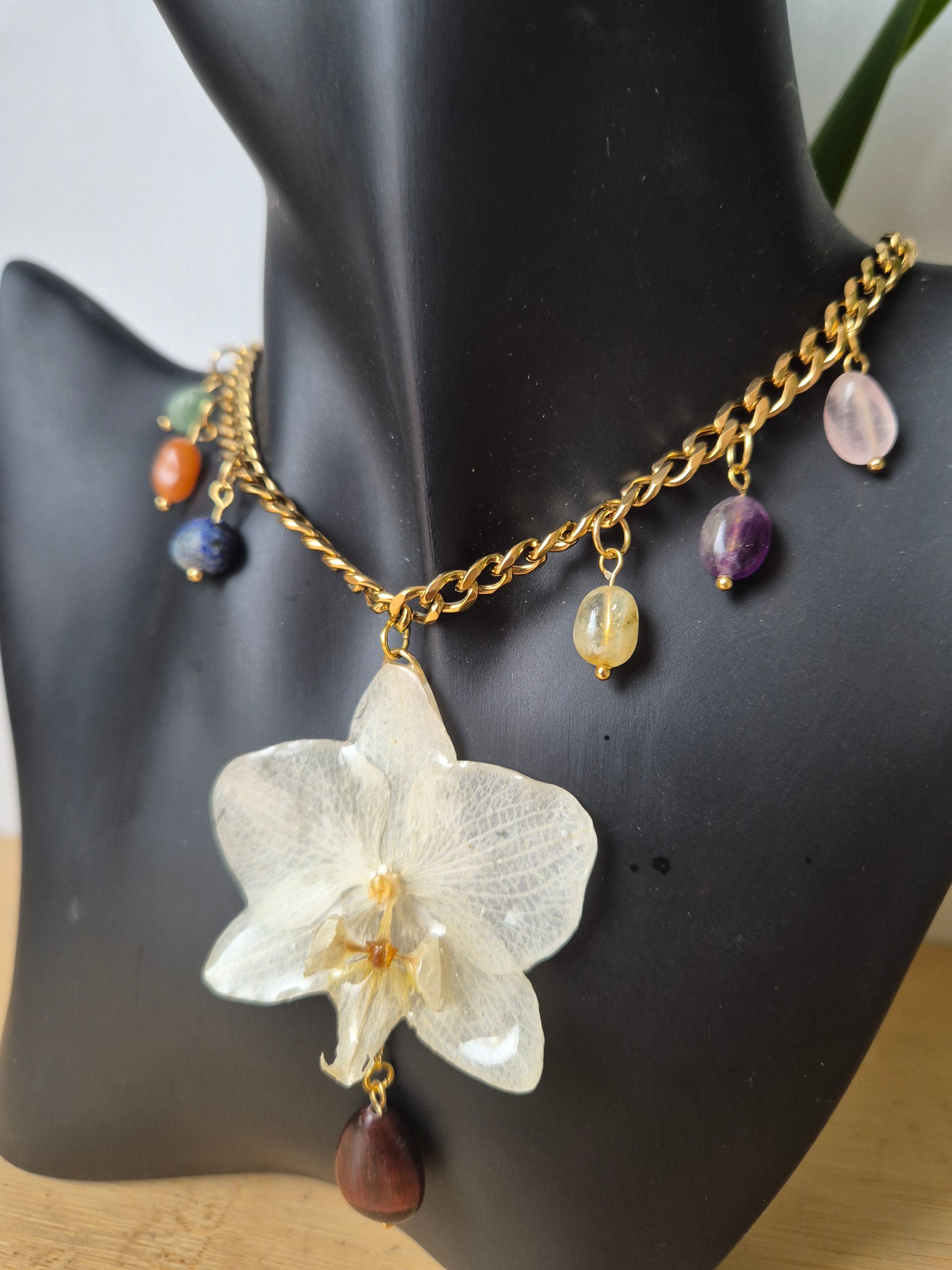 Colgante de orquidea blanca Phalaenopsis con cadena de acero dorada y 7 piedras, fomando los 7 chakras.