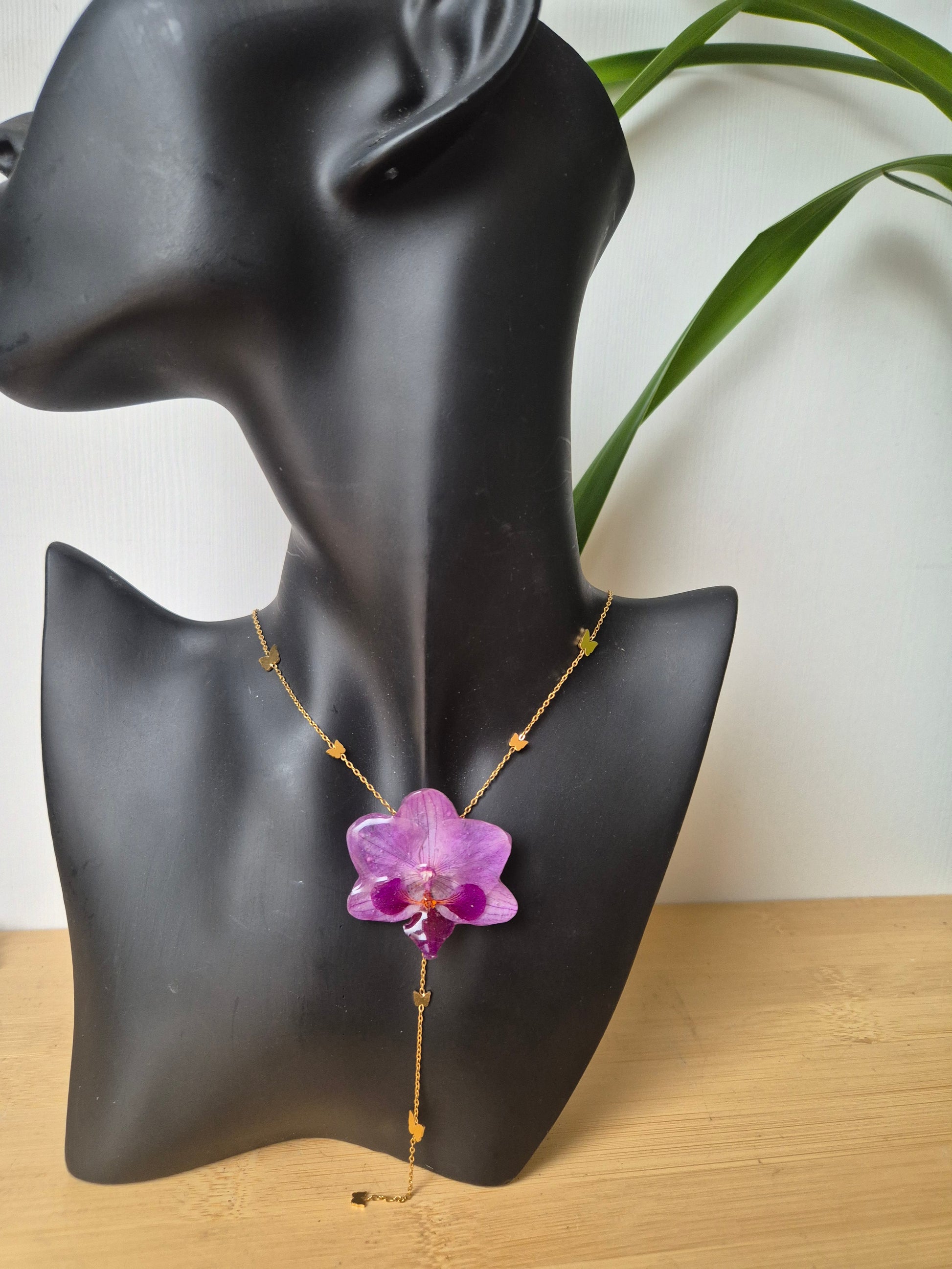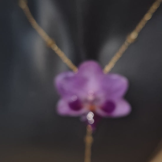 Colgante orquidea morada Phalaenopsis con cadena dorada y detalles de mariposas.