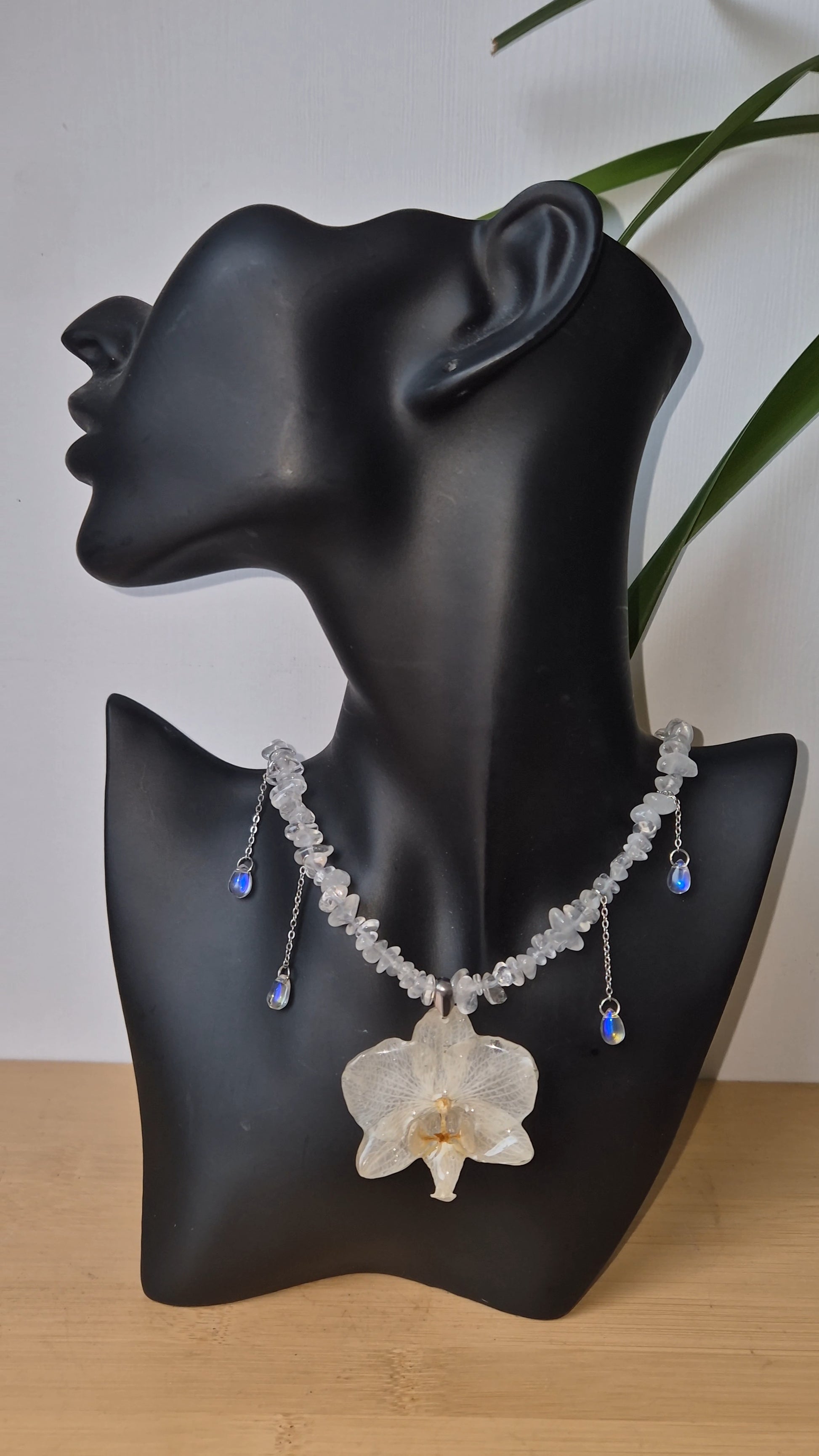 Colgante de orquidea blanca Phalaenopsis con cadena de cuarzos blancos y lágrimas de cristal.
