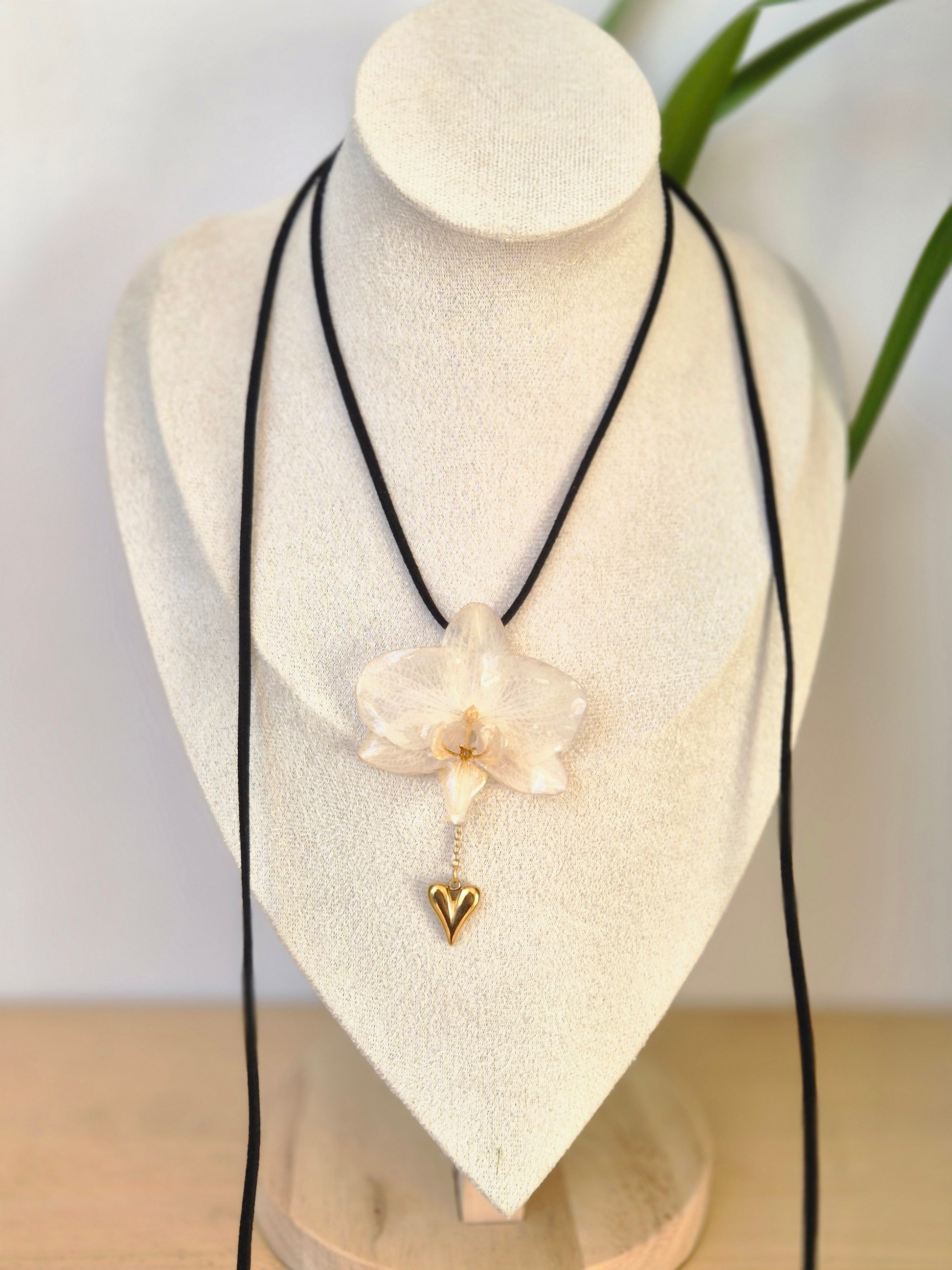 Collar de orquidea Phalaenopsis blanca, con collar ajustable en altura de cuerda de terciopelo multiposicion.