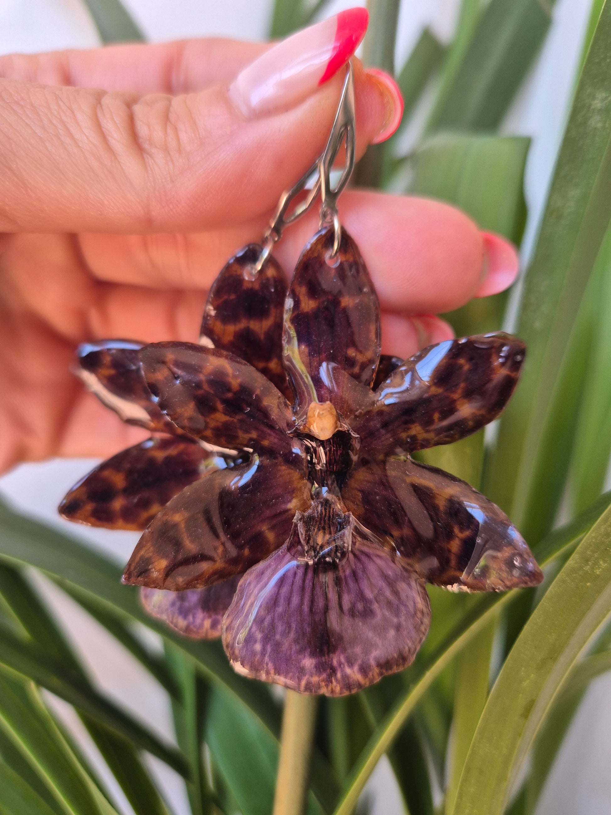 Pendientes orquidea Zygopetalum tonos marrones y violeta. Una flor exótica. Terminación gancho plateado.