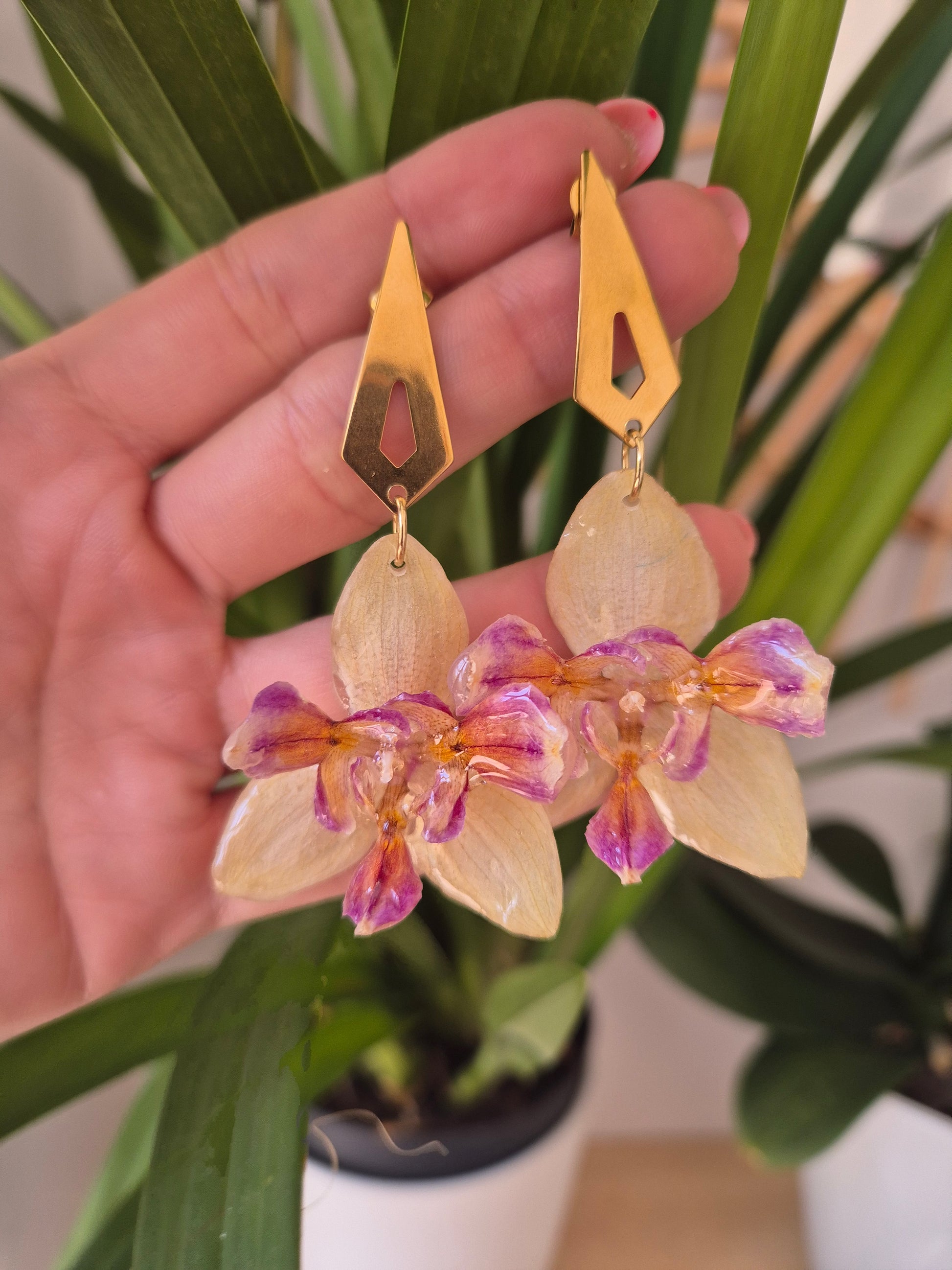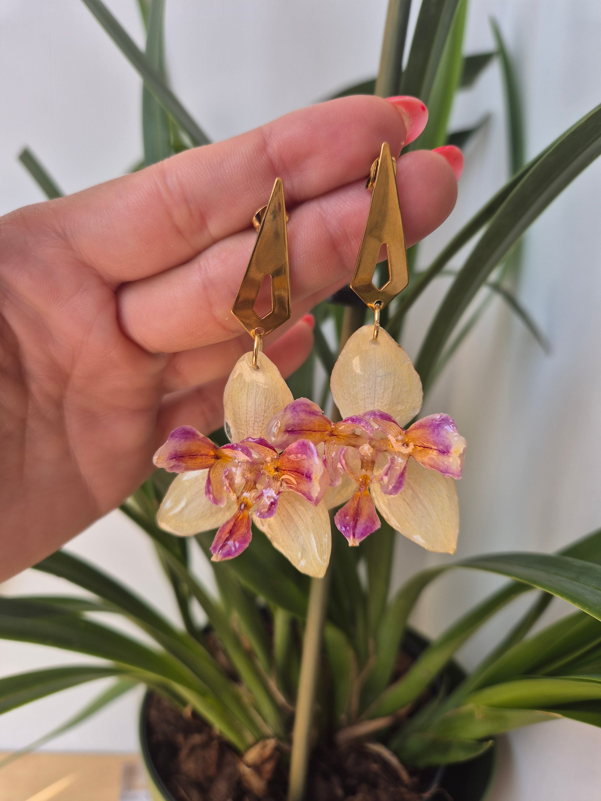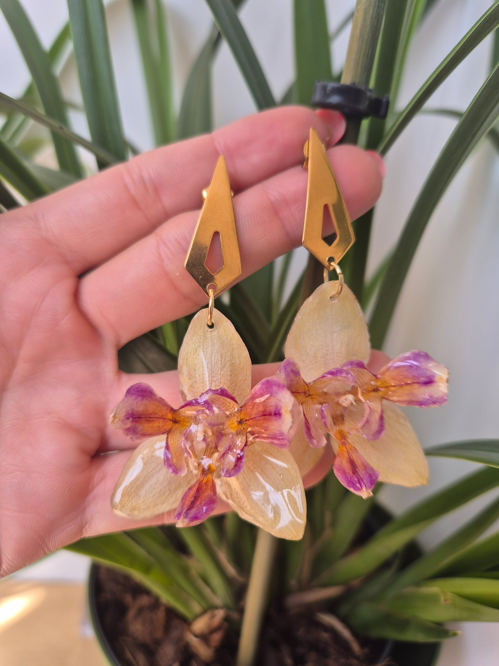 Pendientes orquidea Phalaenopsis Red Dragfly en tonos amarillos y rosados. Terminación gancho dorado.