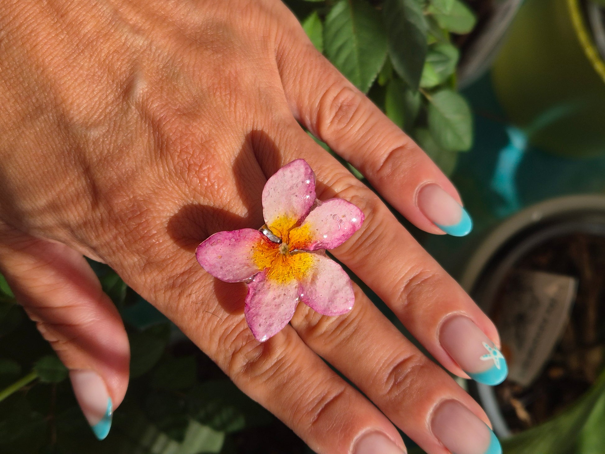 Anillo ajustable, realizado con flor de plumeria real. También conocida como flor de Mayo.