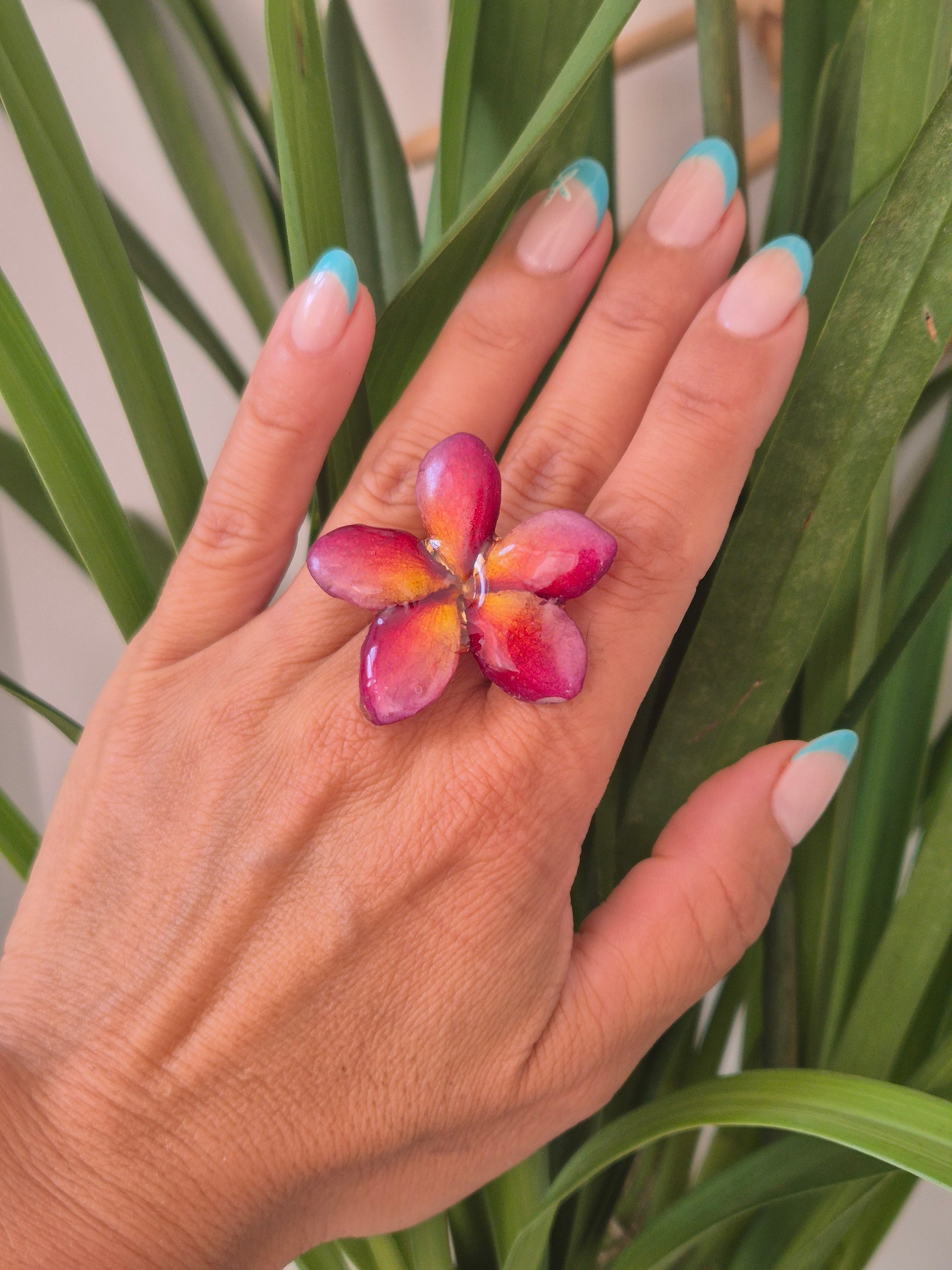 Anillo ajustable, realizado con flor de plumeria real. También conocida como flor de Mayo.