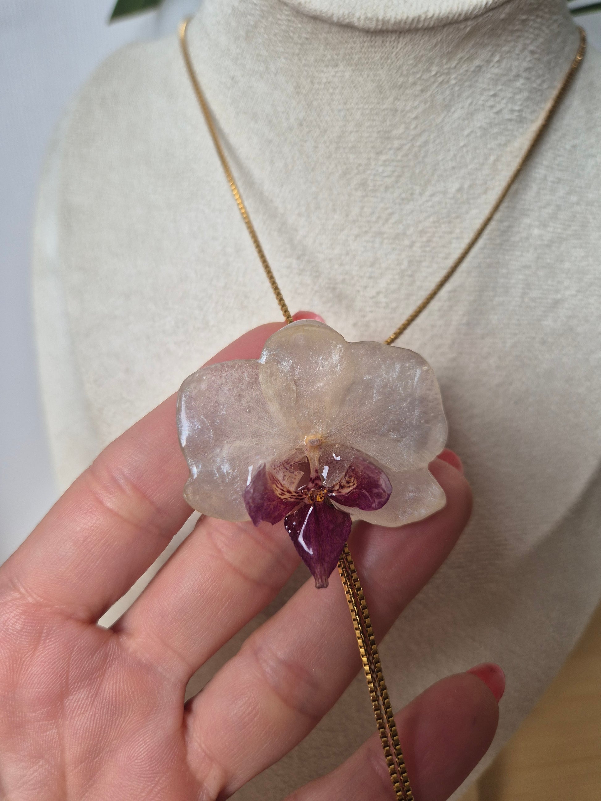 Collar de orquidea Phalaenopsis blanca perla y rosa, con collar ajustable en altura y terminación dorada.