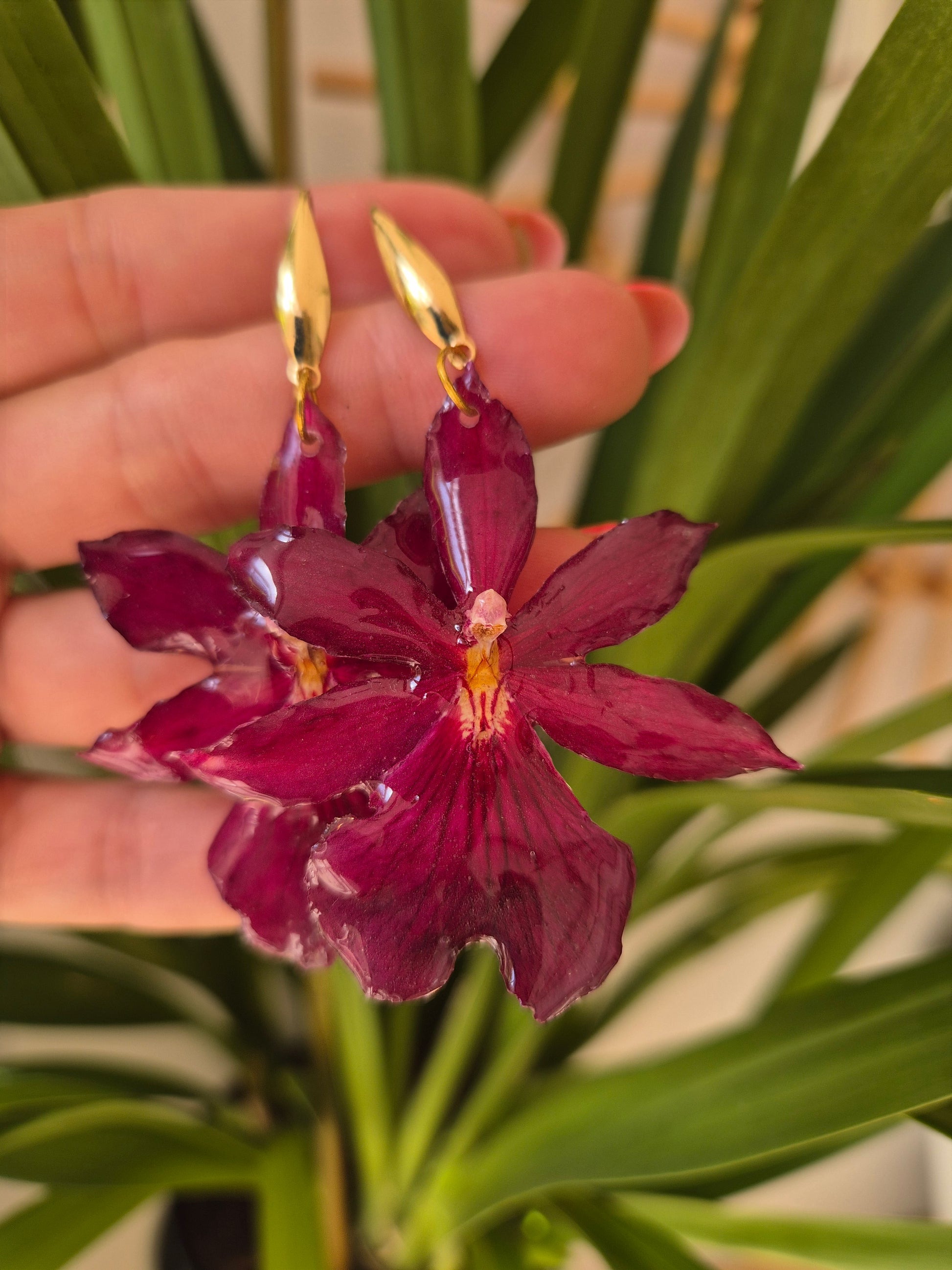 Pendientes orquidea cambria en tono rojo. Terminación cierre dorado.