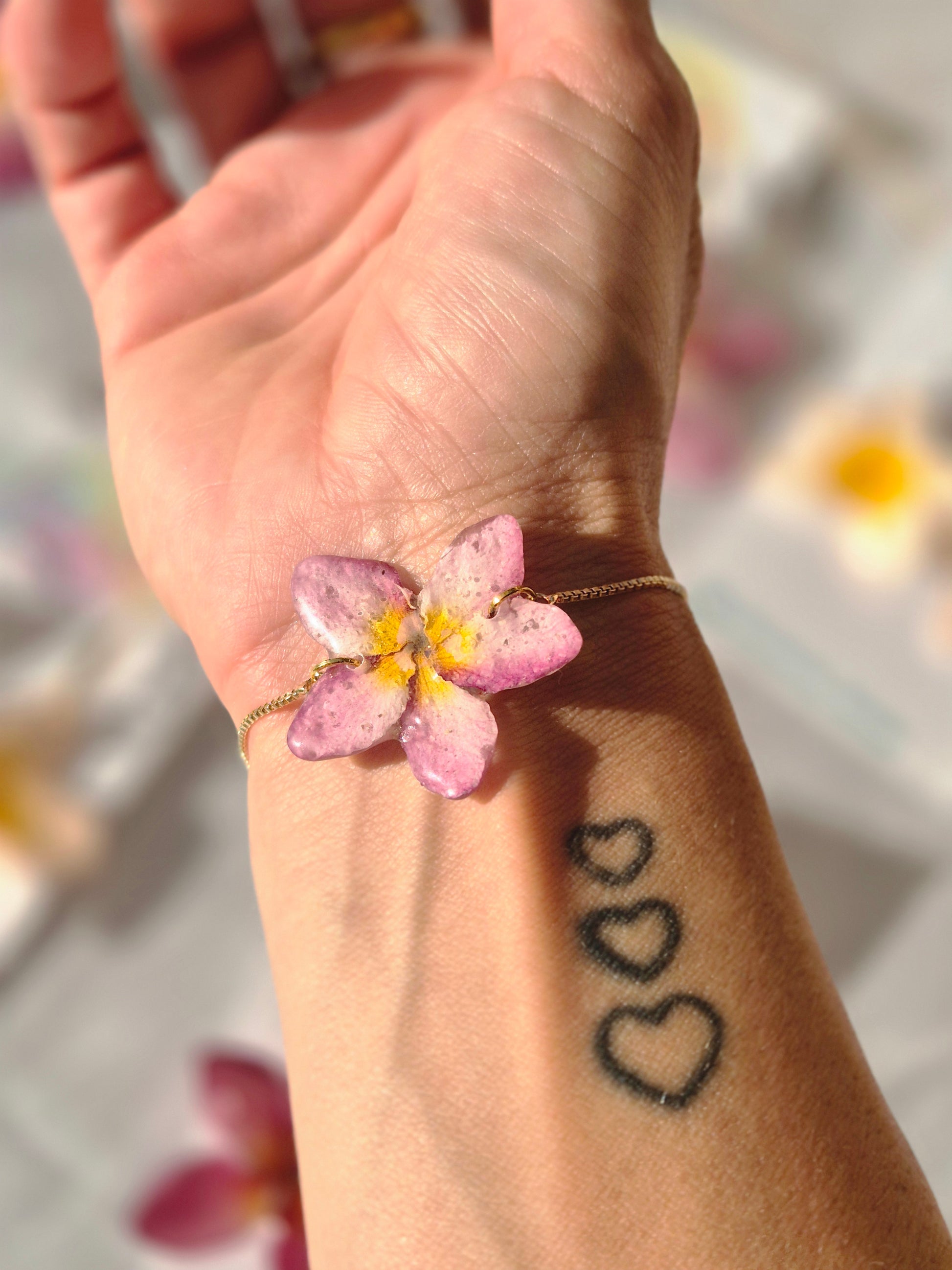 Pulsera regulares dorada de plumeria mini rosada y amarilla